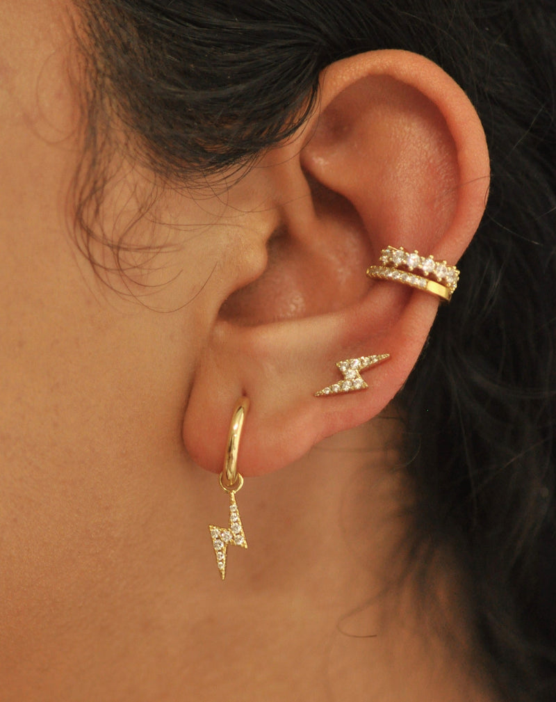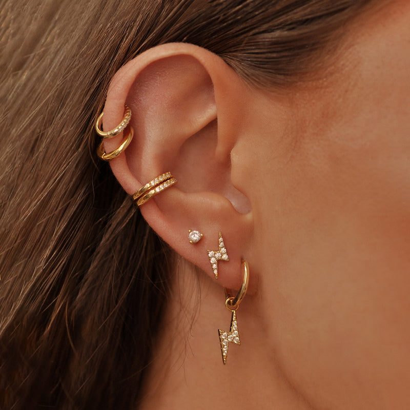 The Baby Bolt Earrings features a sparkling CZ pave lighting bolt, set on a dainty gold huggie. Perfect for stacking, pair them with our matching Bolt Stud for the complete look.