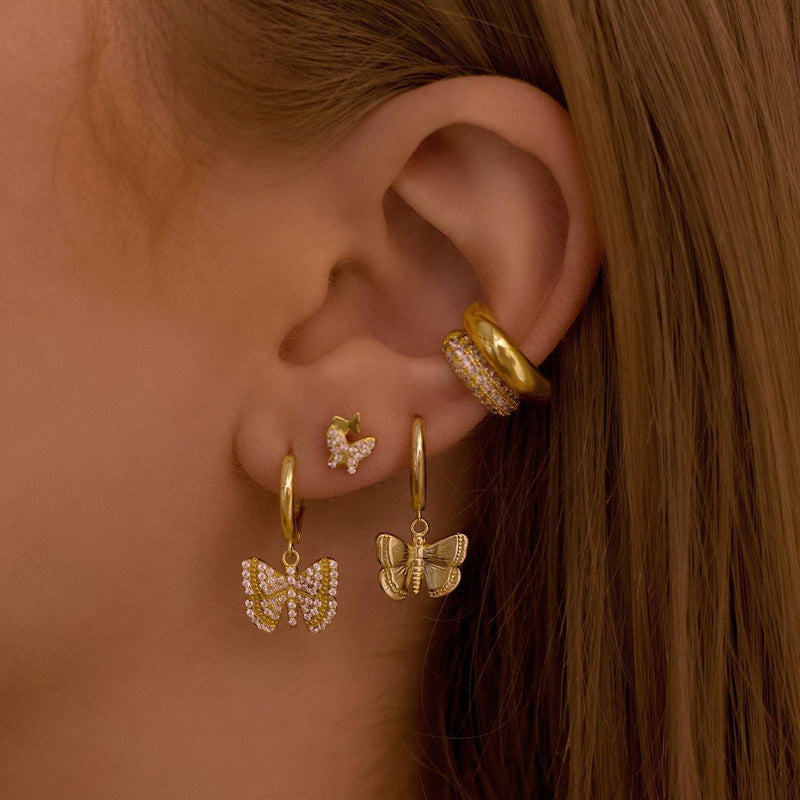 The Butterfly huggie earrings are made for dreamers, featuring a shimmering butterfly pendant set on a dainty gold huggie. Wear them alone or stack with our matching Butterfly Stud for the perfect look.