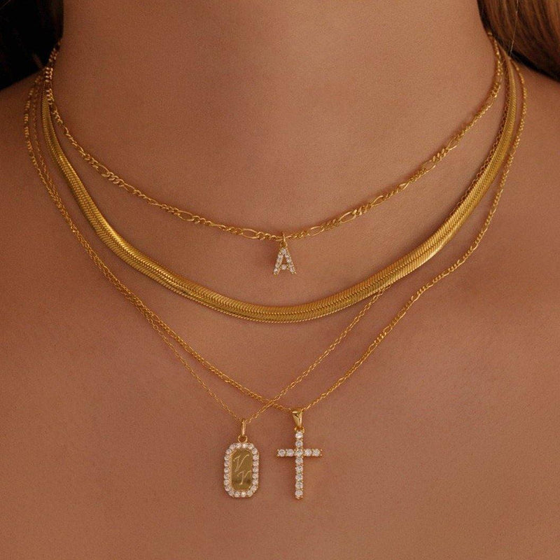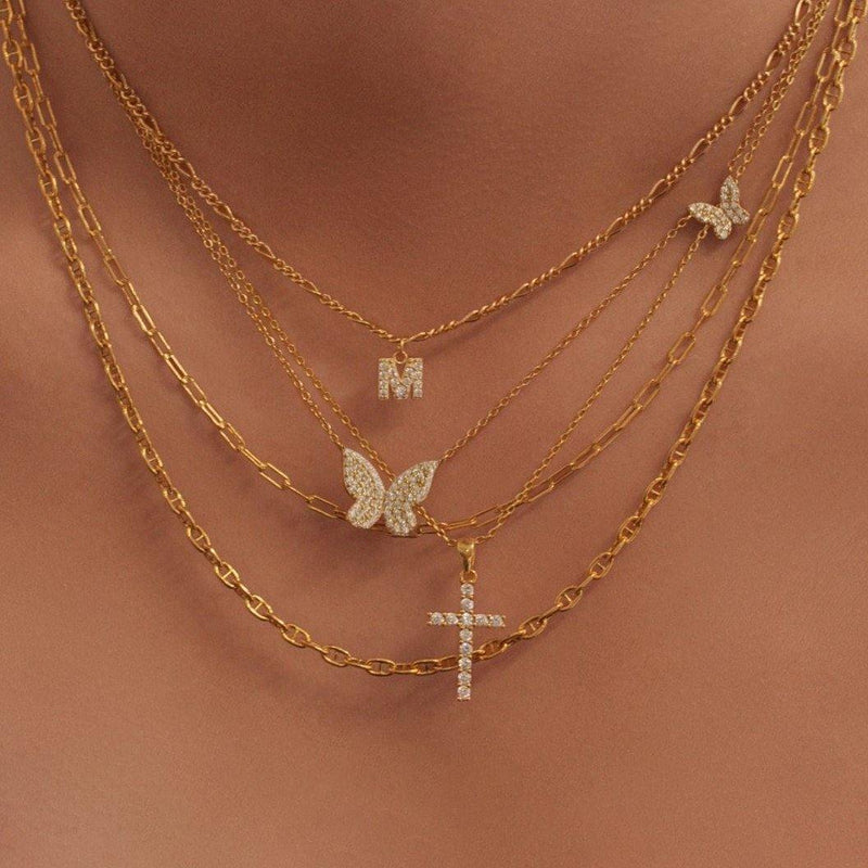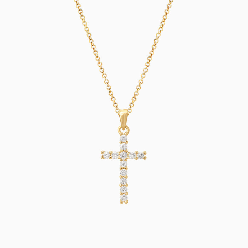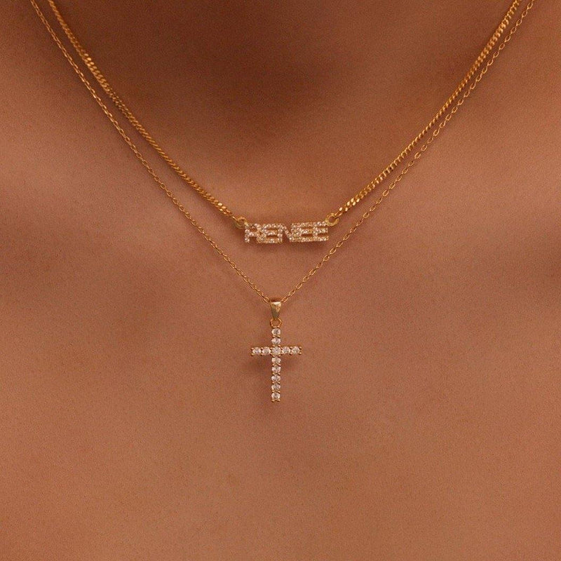 The Crystal Cross Necklace is a beautiful statement piece. It features a fine gold chain with a dangling cross pave, set with white CZ crystals. Perfect for layering, pair them with our signature Tiny letter Choker and Kitty Tag Necklace.