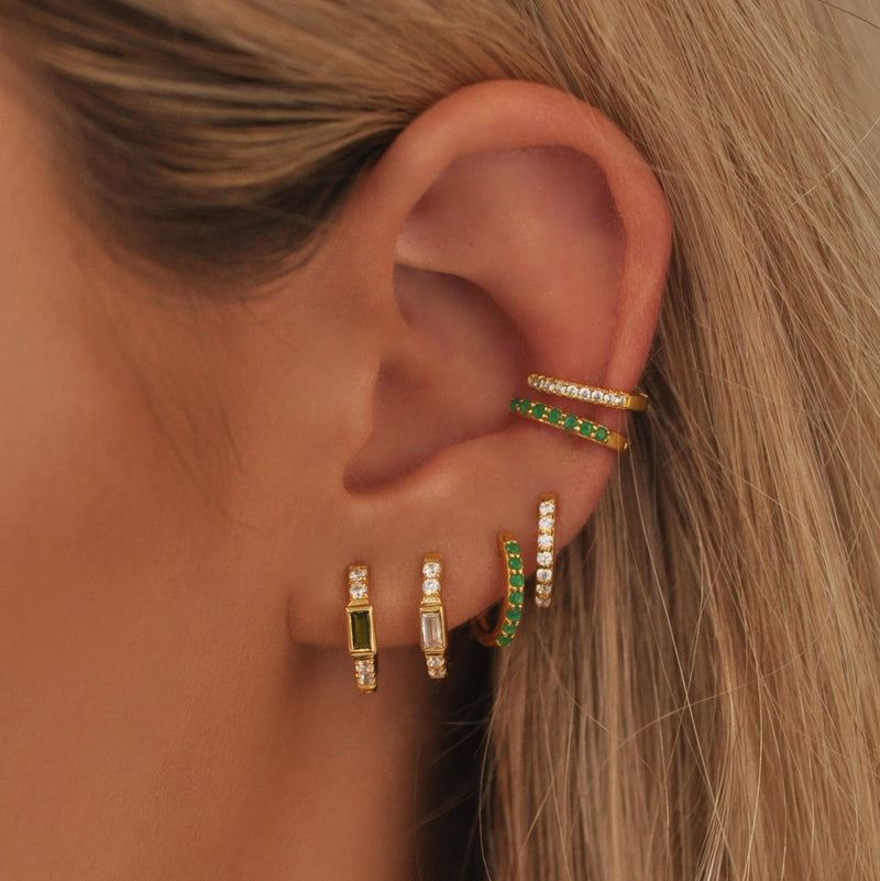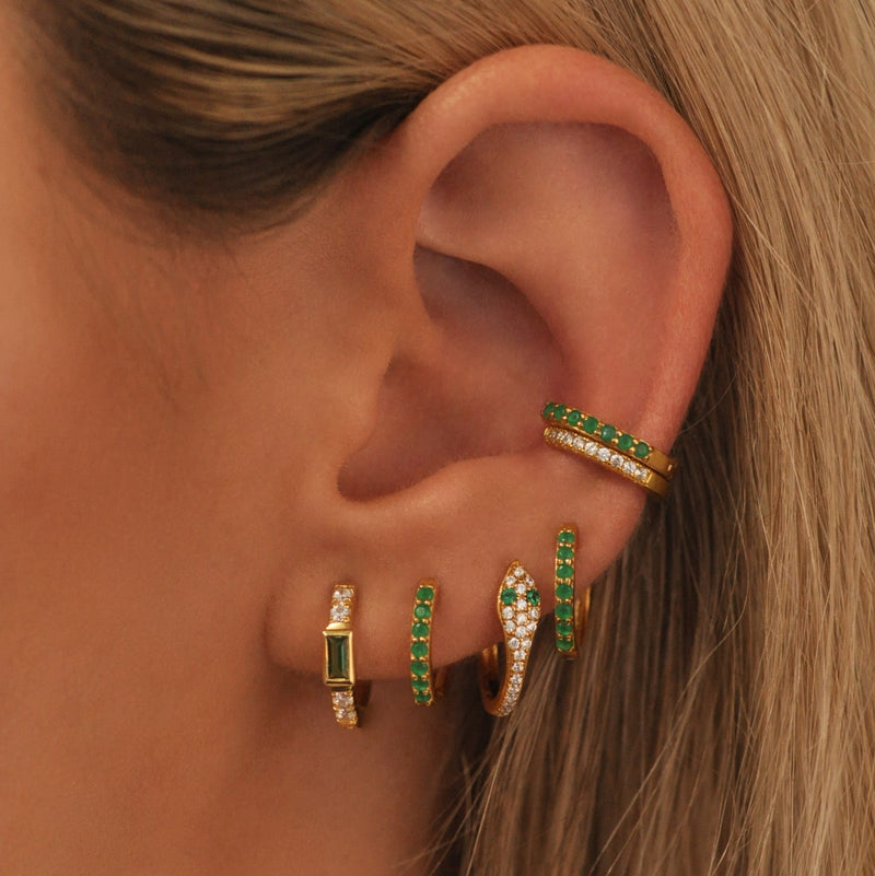 Delicate, classic huggie earrings that you can wear everyday. The Emerald Green huggies are embellished by micro pave green CZ stones, with just the right amount of sparkle. It can be worn alone for an elegant look or stacked to perfection with your favourite earrings.