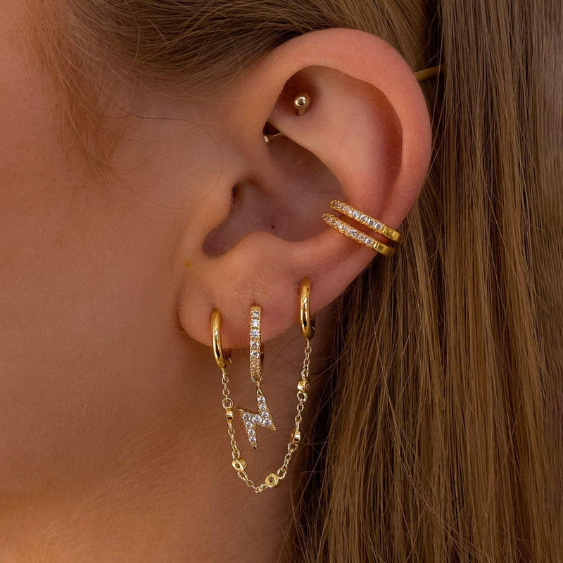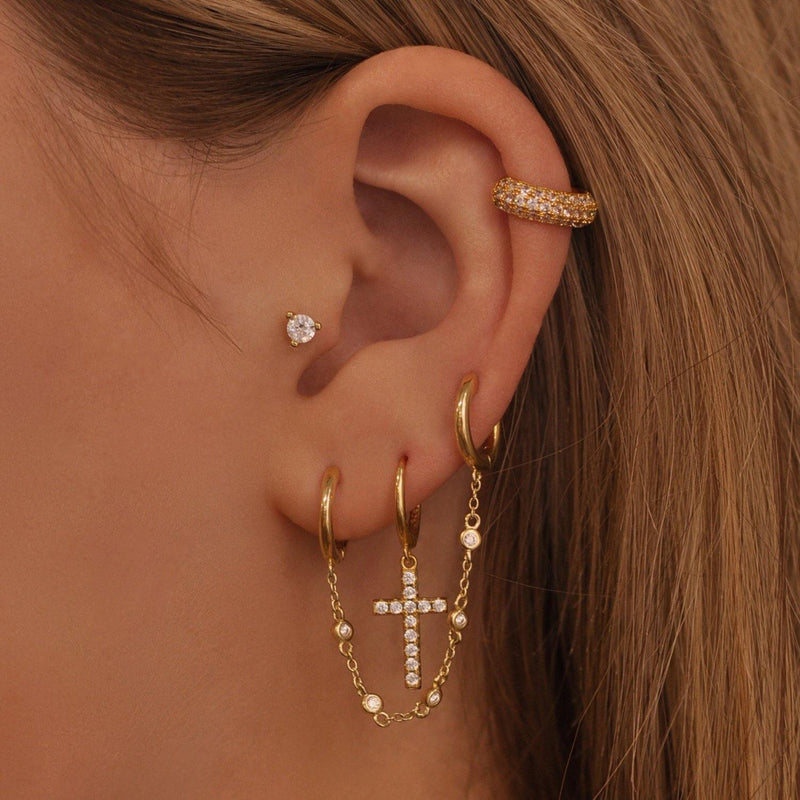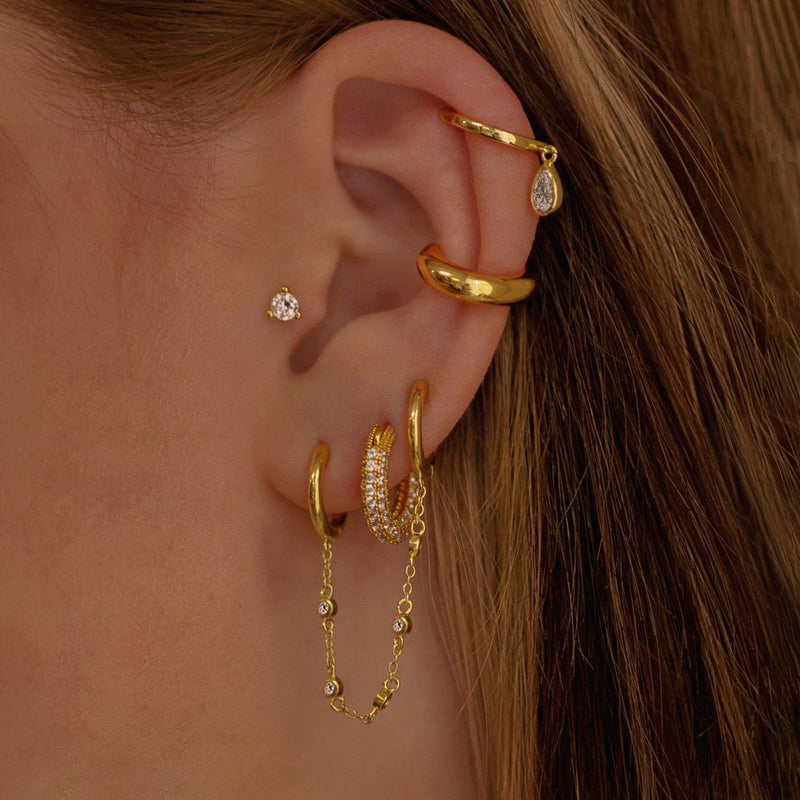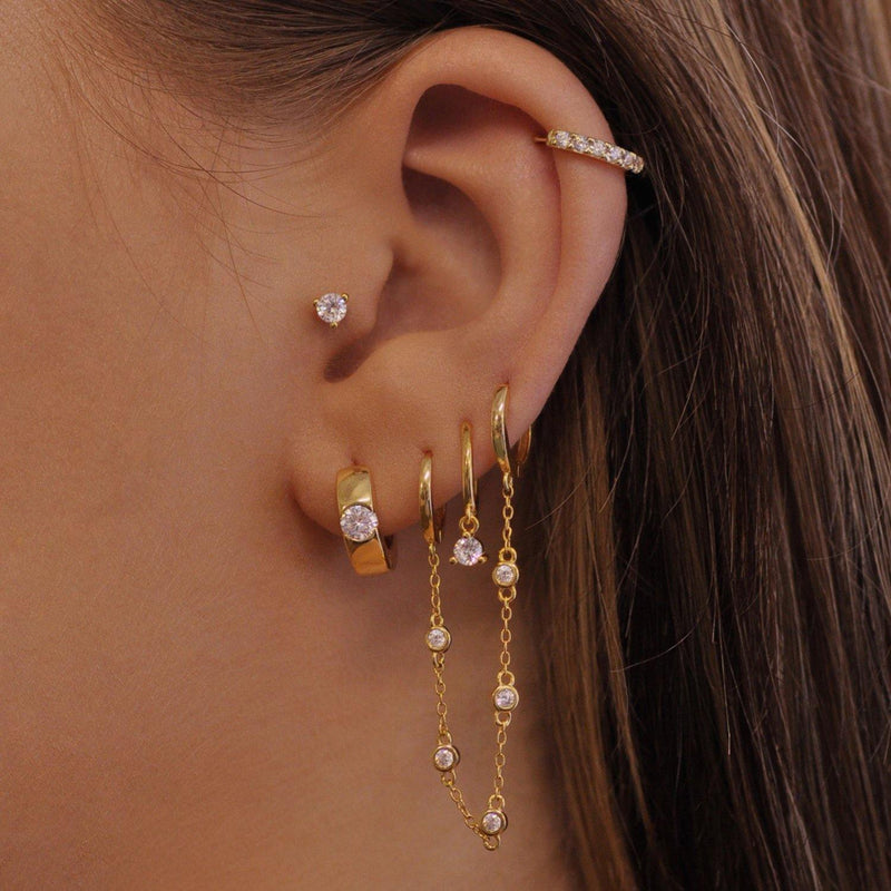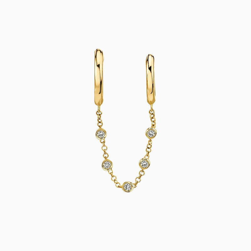 Mia Double Chain Earring featuring two huggie hoops connected by a delicate CZ bezel chain. This double huggie is designed to adorn seperate piercings.